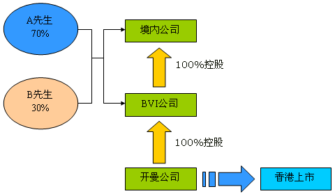 3、接著,對BVI公司增資,再與A先生和B先生進行股權轉讓,收購他們擁有的內地公司的股權,則內地公司變為BVI公司的全資子公司。BVI公司在開曼群島或百慕大群島註冊成立一家離岸公司作為日后在香港掛牌上市的公司。