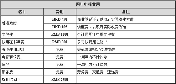 註冊后第二年起每年維護費用為 1,950 美元,包括政府規費,註冊地址及註冊代理費。上述收費只包括註冊資本不多于 50,000 美元的公司。維護費用所包含的政府年度牌照費必須于每年一月份繳納給開曼公司註冊處。