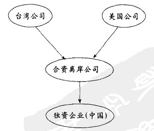 但在談判過程中,其中一個條款涉及收購期權(call option)和出售期權(put option),美國公司希望在一定條件下有權選擇收購臺灣公司在獨資企業中的股權.而臺灣公司作為時等條款希望在一定條件下有權選擇向該美國公司出售其在獨資企業中所擁有的股權。由于目前中國在收鉤期權及出售期權方面無具體而明確的規定,而且在行使上述期權時,由于發生股權轉讓.還須經過中國政府的審批,因此雙方討論決定先成立一家離岸公司(離岸合資公司),然后再利用該離岸合資公司在中國設立獨資企業,用這種方法設立獨資企業后的公司架構如下: