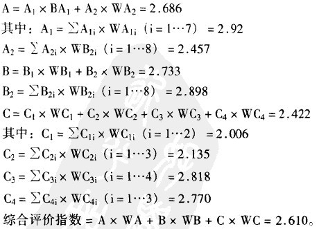產生這一結果主要是因為對“企業內在成長性”貢獻率較大的“企業技術創新能力”(WA21=0.153)、“戰略管理能力”(WA25=0.139)、“經營效率”(WA27=0. 124) 和“組織創新能力”(WA26=0.120)得分都較低,分別為2.0, 2.0, 2.5和2.4。其次,從企業運作的“規范性”來看,總得分僅為2.422,其中貢獻率較大的“產權規范性”(WC1=0.278)得分只有2.006,另外,“業務規范性”得分也較低,為2.135。這是因為決定“產權規范性”的兩個待評價指標得分都較低,“產權明晰程度”為1.5,“產權結構安排情況”為2.4,在“業務規范性”方面,貢獻率最大的“核心技術”(WC22=0.400)得分只有2.0,“非經營性資產比例”與“專業化經營”得分較低,為2.505,主要原因在于貢獻率較大的“學習能力”(WB15=0.228),“對技術應用的敏感性”(WB14=0.224)和“信息面”(WB12=0.221)的得分較低,分別為2.5, 2.5和2.4。