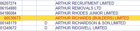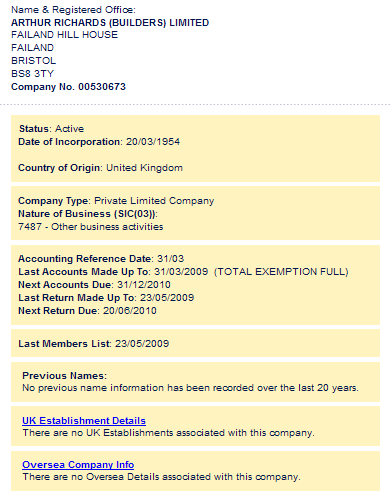 您可以在Company Name后的空格內輸入您要查找的公司名,如:ARTHUR RICHARDS (BUILDERS) LIMITED,然后點擊 SEARCH,您便可以看到以下內容 (圖示2):