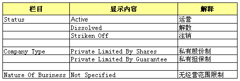從這個頁面上您可以看到公司的名稱和註冊地址(Name & Registered Office), 公司的註冊號碼(Company No.),公司狀態(Status),成立時間(Date of Incorporation),公司類型(Company Type),公司營業性質(Nature of Business),報稅日期(Next Accounts Due),年審日期(Next Return Due)。