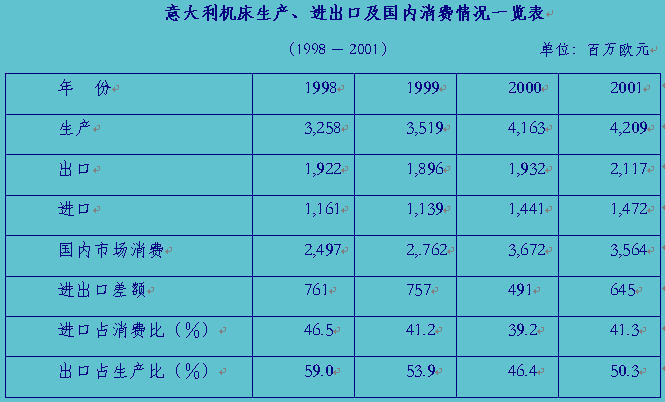 意大利目前有機床生產企業約450家,機床經營企業約120家。近幾年來,意大利機床生產量逐年增加,產值1998年為32.58億歐元,1999年為35.19億歐元,2000年為41.63億歐元,2001年為42.09億歐元。2001年與1998年相比產量增加29.19%。意大利機床的出口約占生產總量的半數以上(詳看附表)。意大利國內機床需求量1998年為24.97億歐元,1999年為27.62億歐元,2000年為36.72億歐元,2001年為35.64億歐元。