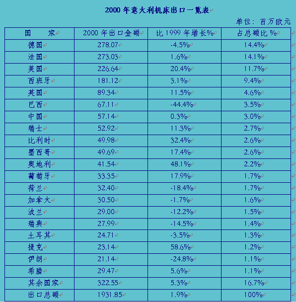 意大利是世界機床出口大國之一,以2000年為例,機床出口總額為19.31億歐元,占世界出口總量的8.35%,居世界第四位(前三位是:日本、德國、瑞士)。意大利機床出口的前十位國家是(按照金額大小順序排列)德國、法國、美國、西班牙、英國、巴西、中國、瑞士、比利時、墨西哥。僅前6個國家(1998至2000年)平均出口額就達到總出口額的55%以上,分別為1998年53.9%,1999年59.4%,2000年57.7%。中國連續三年排名第7位,1998年金額為6067.23萬歐元,占總金額3.2%,比1997年下降33.7%;1999年金額為5694.76萬歐元,占總金額3%,比1998年下降7.7%;2000年金額為5714萬歐元,占總金額3%,比1999年增長0.3%。