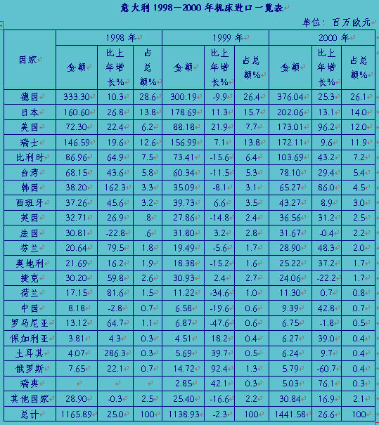 從以上意大利機床進口和出口情況綜合分析看,意大利自1998至2000年連續3年機床進出口均為順差:1998年為221.57%,1999年為213.5%,2000年為193.27%。只有對日本、德國、臺灣地區、韓國的機床進出口是逆差,特別是對日本、臺灣地區、韓國機床出口幾乎是零,而從這3個地區進口機床卻占意大利機床進口總額的25%。