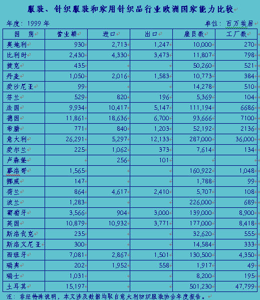 生產和銷售――2000年意大利服裝制造行業開始恢復增長,總產值同比上升了4.5%,營業額也比上年增加了6%。恢復增長雖未遍及全行業的每個領域,但一些重點領域如男女針織服裝和女式戶外裝的生產和銷售形勢較好,這些領域總產值的增幅均在5%以上。一些小的領域,如對時尚趨勢異常敏感的皮裝,2000年總產值增長了30%,令業內人士大喜過望。服裝配料扣子的生產也有較大增長。此外,市場對針織面料、泳裝和內衣的需求略有增長,但增幅不大。意大利市場對家用針織品的需求依然低迷,襯衫、嬰兒裝及時裝配件(圍巾、頭巾等)等,除絲綢產品外,生產和銷售均呈下降的趨勢。