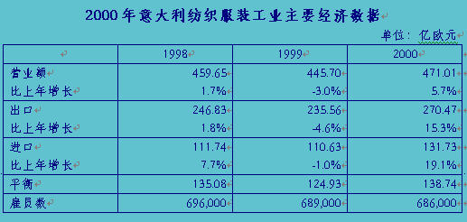 2000年,意大利紡織品服裝行業也因美元繼續走強和大西洋兩岸國家經濟增長浪潮的推動而走出危機并得以恢復增長。這在出口領域表現得最為明顯,全年出口比上年增長了15.3%。