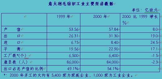 生產和銷售――2000年意大利毛紡織行業產值達到57.84億歐元,比上年增長8%,高于當年意大利紡織服裝行業的平均增長值。其中出口31.30億歐元,比上年增長19%(根據出口數量計算則增長17.3%),其產品在境外銷售的營業額占毛紡織行業總營業額的54.1%;由于羊毛價格的上升,以及毛紡織相關行業經濟活力的恢復,意大利對毛紡產品的進口也呈穩步增長的態勢,2000年進口總額8.40億歐元,比上年增長24.5%。全行業外貿順差22.72億歐元,比上年增加了約3.10億歐元。