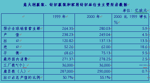 2000年全年意大利紡織服裝業出口總額約270.47億歐元,同比增長15.3%;進口約131.73億歐元,同比增長19.1%。外貿順差138.74億歐元。