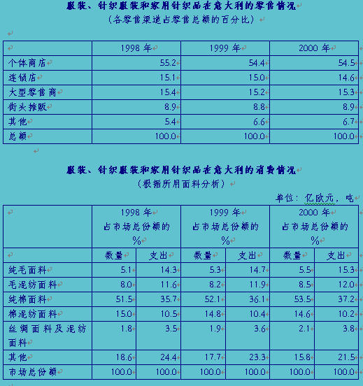 國內消費――2000年意大利本國對服裝的消費約達278.25億歐元,比上年增長2.5%。其中市場對針織外衣和皮裝的需求比上年增長10%強;對內衣和泳裝的需求增長接近平均水平;男外衣市場比較蕭條,對女式外衣的需求呈下降趨勢;意國內對女式針織品、嬰兒裝、領帶、披肩、圍巾和頭巾(真絲頭巾除外)的需求均有不同程度下降。
