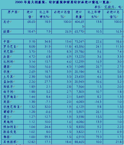 2000年意大利對境外紡織品和服裝進口增長的步伐略快于出口增長。其中從中國進口比上年增長37.9%,并由此改寫了當年意主要紡織品和服裝進口國家的結構圖,中國成為超過德國的意大利紡織品服裝的主要供應國。此外,意大利從一些東歐國家的進口也相當活躍,主要有羅馬尼亞、匈牙利和捷克共和國。
