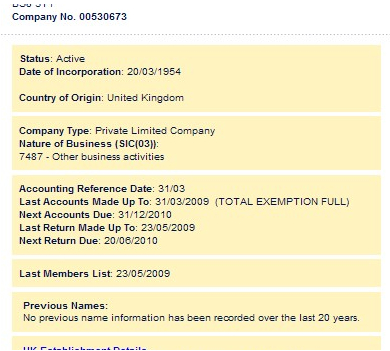 從這個頁面上您可以看到公司的名稱和註冊地址(Name & Registered Office), 公司的註冊號碼(Company No.),公司狀態(Status),成立時間(Date of Incorporation),公司類型(Company Type),公司營業性質(Nature of Business),報稅日期(Next Accounts Due),年審日期(Next Return Due)。