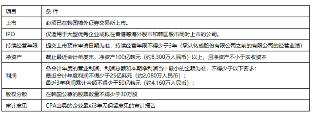 2004年底开始,韩国证券期货交易所KRX开始会同有关政府部门修改相关法律法规,以吸引包括中国上市公司在内的外国优秀企业到韩国上市。目前外国企业在KRX上市的条件和程序如下: